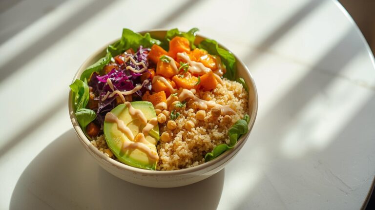 Quinoa bowl with roasted vegetables and tahini dressing