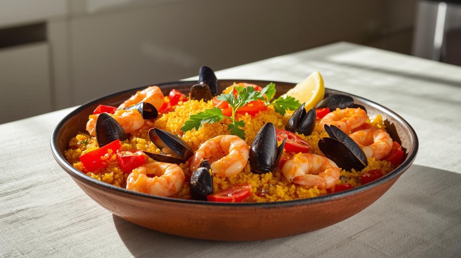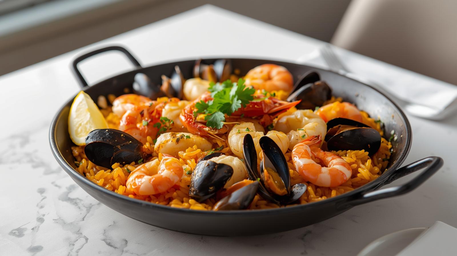 Authentic Spanish paella featuring shrimp, mussels, calamari, and chicken, cooked with saffron-infused rice and mixed vegetables.